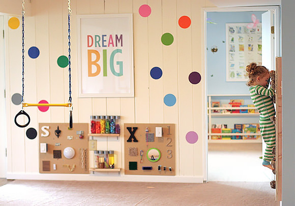 This DIY Sensory Gym is just one of Fun At Home With Kids’ ideas for transforming an ordinary kids playroom into one that inspires activity—an important topic as we head into indoor weather.