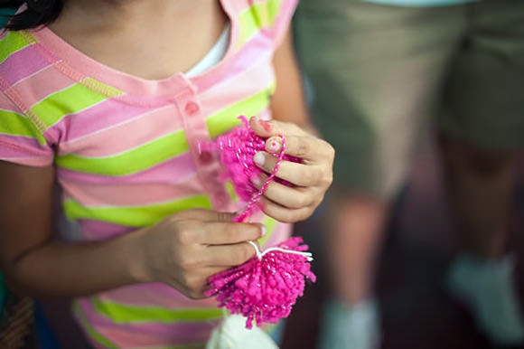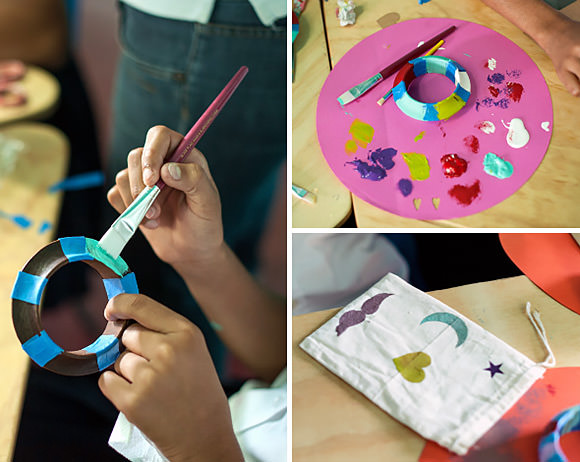 Since I had to travel with the craft supplies, I kept it light: stencils, muslin bags, a dozen or so simple wooden bracelets I picked up in the garment district in NYC last summer, and some yarn for making pom-poms. Most of the children ended up making Christmas gifts for their mothers—how sweet is that?