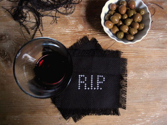 Black is my favorite color for this time of the year, always elegant and full of symbolism. Make a simple and chic embroidered decoration for absolute beginners with these unique and very easy to make coasters—just three letters stitched in white on black fabric; use glow-in-the-dark embroidery thread to make it bright.