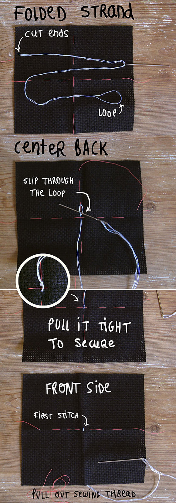 Cut a-27 inch long strand of your glow-in-the-dark embroidery floss. Fold the floss in half so the cut ends are together and there’s loop at the other end of the tail. Thread the two cut ends through the eye of the needle. Sew your first back stitch in the center of the fabric. As you pull your thread through the back side, carefully loop your needle through the thread loop to secure.