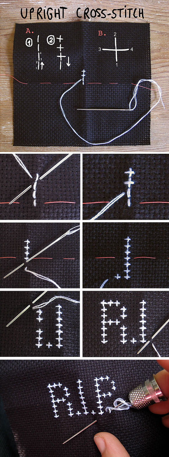 Use upright cross stitches for embroidering the letters. These comprise two stitches of equal height and width. Always make the vertical stitch first to ensure the horizontal stitch always ends up on top. You have two easy options for making this stitch: (a) back stitch all the stitches first then straight stitch in the middle of each one or (b) make each cross stitch individually.