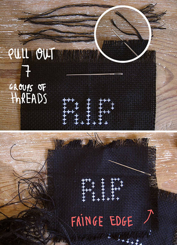 Make a self-fringe edge along all four sides by pulling out 3 to 7 groups of horizontal threads from the edge of the fabric to get the desired fringe width.