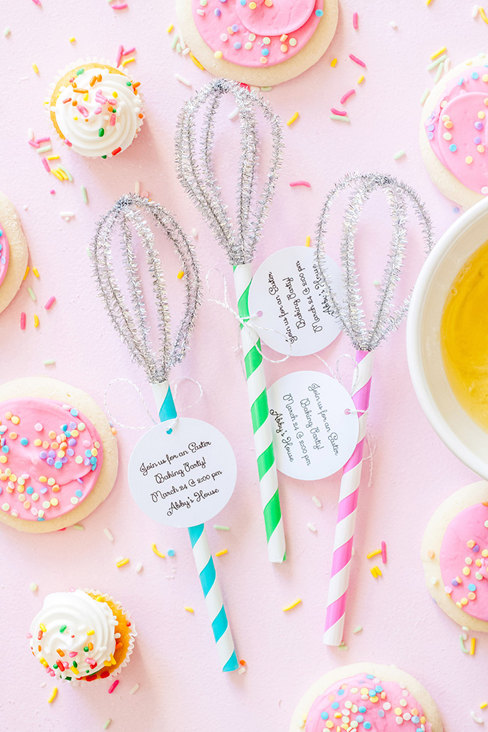 Growing up, we made sugar cookies twice a year…once for Christmas, and then again for Easter, and we are carrying that tradition on with our kids. This year we may ask some friends to join in the fun, and I figured there’s no better way, than to hand out some handmade “whisk” invitations! These are so easy to “whip” up (pun intended), and friends will be delighted to receive such a unique little invite.