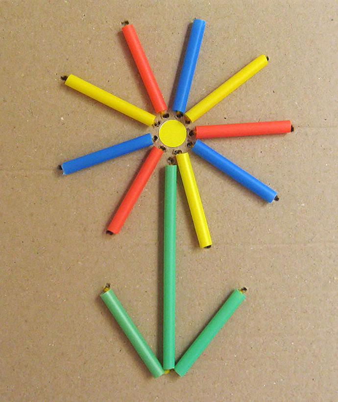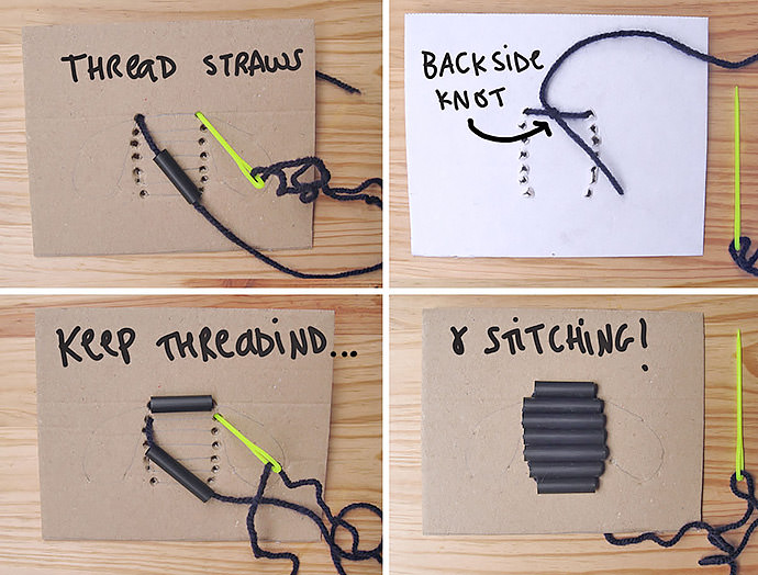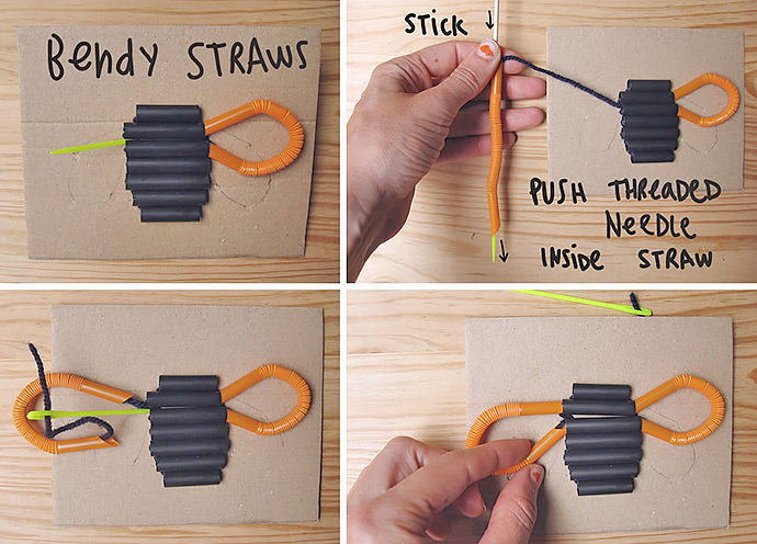 I love straws! They’re readily available, easy to work with, and super fun. I thought it would be cool to add some plastic straw pieces to a stitching project for kids, cutting the straws and using them as big beads. Besides the wide variety of sizes and colors, you can even use bendy straws to draw smooth curves. The possibilities are endless…