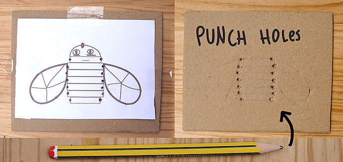 Download and print templates. Choose the design you want to embroider and cut it centered on a piece of paper a bit smaller than your cardboard. Fix printed template to cardboard with tape. Then punch holes using a sharpen pencil.