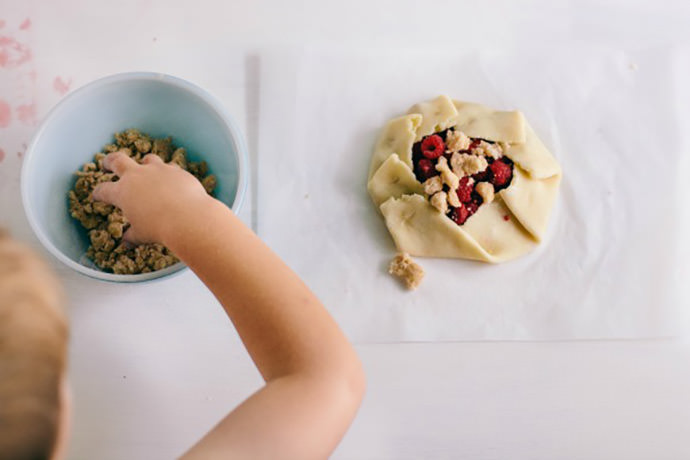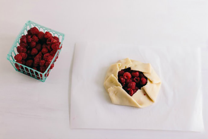 Toss the fruit and sugar together. Divide the raspberries evenly between the dough rounds (about ½ cup of the raspberries for each tart), in the center, leaving a 1-inch border. Fold the outermost dough over the fruit, pleating it as you go (about every 2-3 inches). Sprinkle the dough with the streusel. Using a pastry brush, brush the dough with water and sprinkle with a bit of sugar.