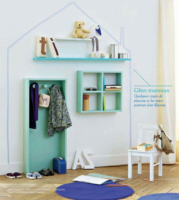 An outline of a house painted on the wall of this kid’s room ties together a grouping of shelves and coat rack. (via marie claire idées)