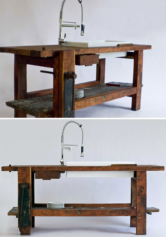 The Olmo kitchen worktable & sink is made from an old carpenter’s bench – even the original vise clamp is still intact.