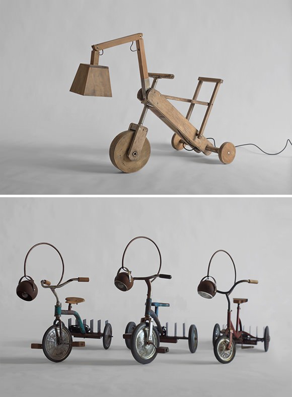 These vintage and wooden tricycle lamps breathe new life into long forgotten toys. They can be wheeled around with ease and there’s even a handy little shelf for your books.