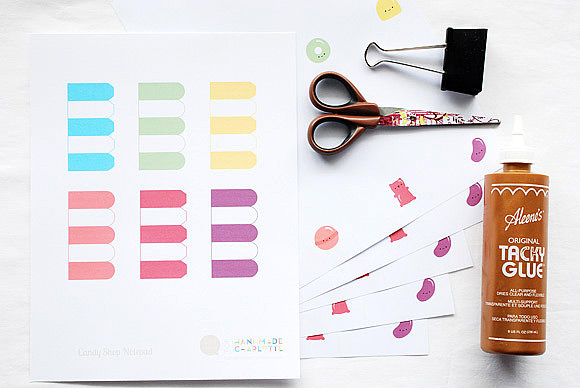 You can buy padding compound designed for making tear-off notepads, but you’d probably need several lifetimes to go through a whole jar. Instead, you can use craft glue (like Aleene’s Tacky Glue) to craft a pad of paper, and with this printable, it will look like a happy little candy shop!