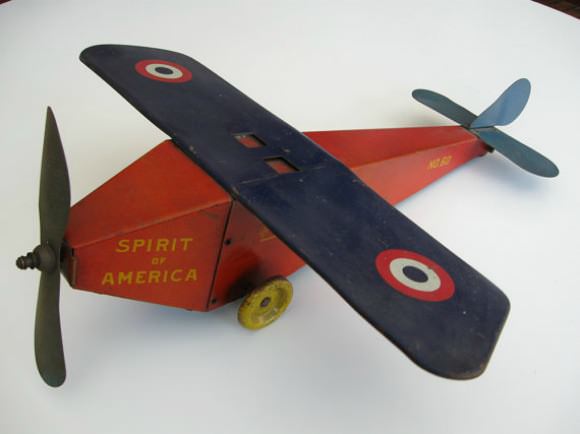 What a beauty! This pressed metal lithographed Spirit of America toy airplane dates back to the 1920s and is believed to have been made by Keystone. It’s way above my Father’s Day budget but one of the finest-looking vintage toy planes I’ve ever come across. Guaranteed to be an original.
