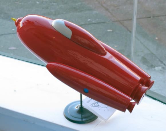 Well, you might have to break the bank for these two vintage French rockets (the blue rocket pictured at top of post), but they look pretty smart all the same. Designed by Christian Poumeyrol and made from lacquered wood, both rockets sit on a removable metal stand. A super cool desk toy for dad!