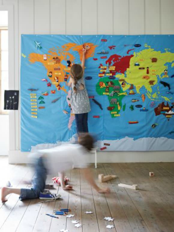 If you’re not overly keen on decals or decorating with wallpaper and have the space for something large, this fabric wall map is an excellent alternative. The map comes with 183 velcro-backed picture and word motifs covering oceans, countries, capital cities, famous buildings, and wild animals, to name but a few. The set even includes a few finger puppets. It’s quite an investment, but I think the whole family would enjoy learning and playing with this!