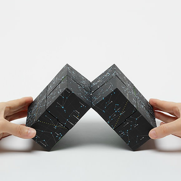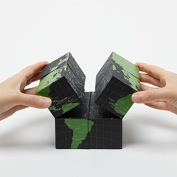 The whole world in your hands! This cleverly designed reversible paper globe packs two faces of the world in one cube. It can be twisted to reveal a celestial globe and, like all Geografia products, is perfect for play and display (thanks, Petits petits tresors!)