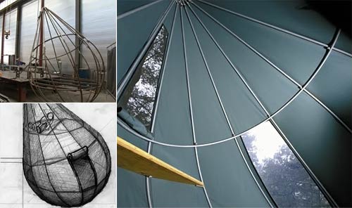 Hanging tents designed by Dré Wapenaar. Inside there is a hardwood floor (9′ in diameter) with a round mattress; sleeps two adults and two children.