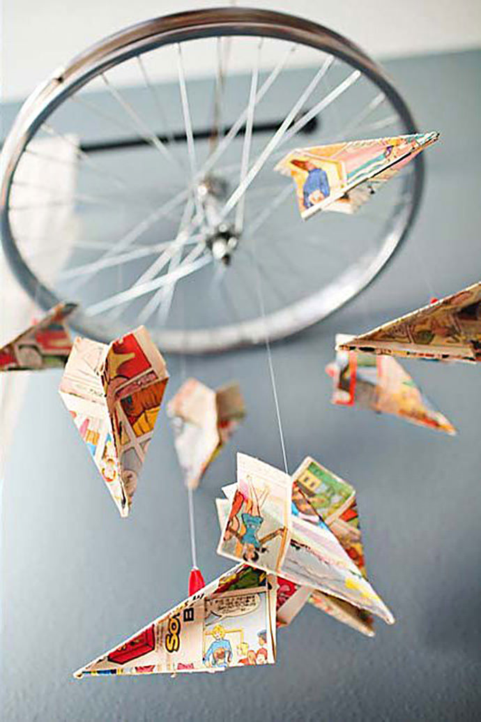The original from Lauren Clark for this plane mobile is gone, but you can see how to make your own pretty clearly from the photos. I love that she used comic book pages for the planes!