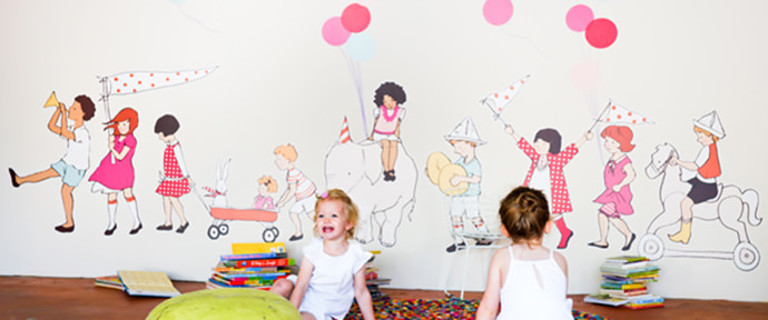 The Sarah Jane Collection is an exciting new collaboration between Pop & Lolli + designer Sarah Jane. The collection includes both decals and wallpapers of fun, fanciful scenes that make you want to reach for the nearest kazoo and join in the parade!