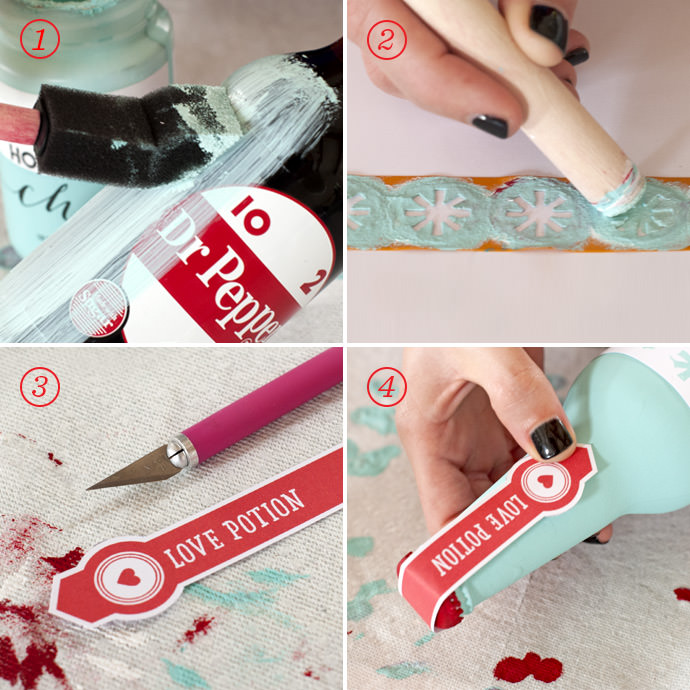 For quick, easy decorating, we called upon the perfect pair: FolkArt Home Decor Chalk Paint and Handmade Charlotte Peel & Stick Stencils. Parents can use the paint to coat the bottle of their favorite old fashioned soda, then crafty little cupids can sweep in and use stencils to create their own custom labels. With hundreds of stencil designs and an endless selection of colors, personalizing the potion is easy enough for even the littlest of lovebirds.