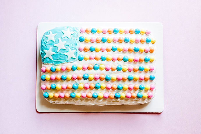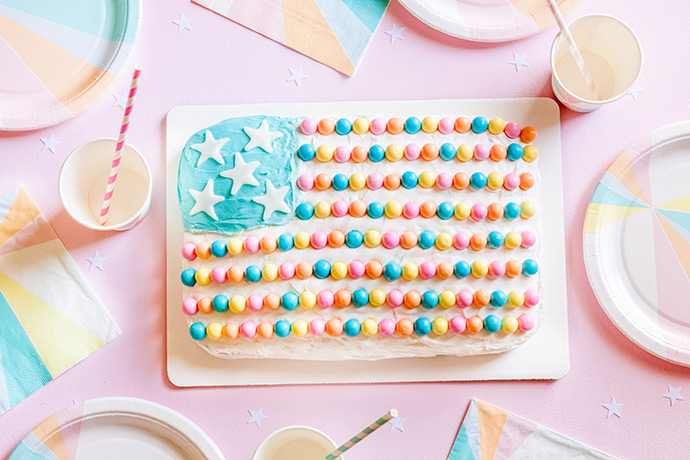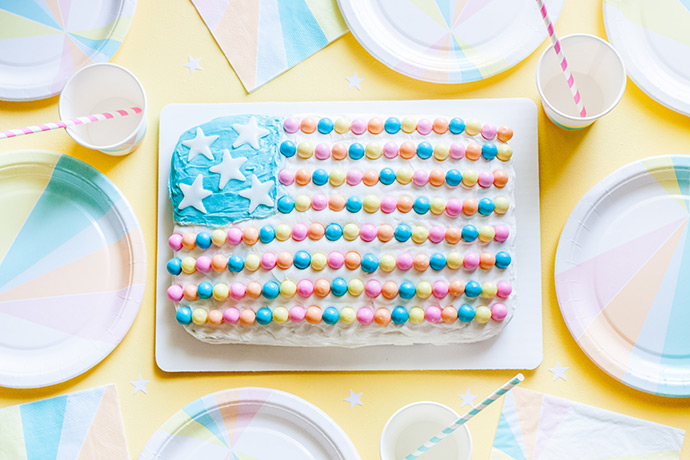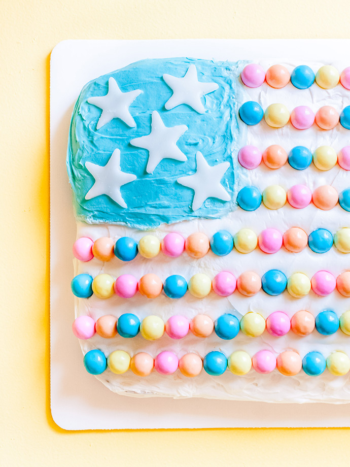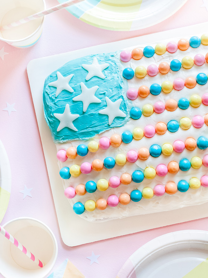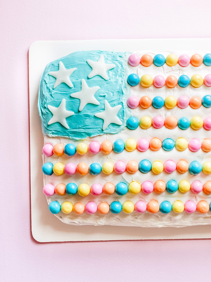 Several years ago, my daughter had a pair of flip-flops with a lavender, peach and white flag on the top. The colors were beautiful together, and I loved the non-traditional palette. I have always wanted to make a flag cake out of some kind of candy, so when I ran across these “smoothie mix” gumballs, I was inspired. I know some people (including my husband) would prefer red, white, and blue, but I personally think this looks like an actual birthday cake – for America! …Or anyone with a birthday that falls on the fourth of July! It’s the perfect dessert to serve to the kids’ table, or it would be fun to host a little pre-fourth kids’ party. I always love a good pastel palette, so I didn’t want to exclude one of my favorite holidays from getting in on the fun!