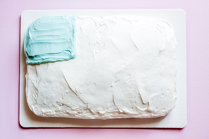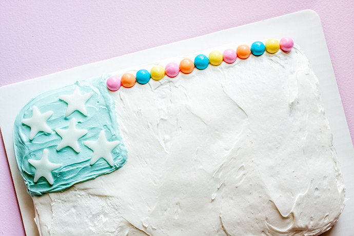 Place a few large spoonfuls of white frosting in a bowl. Mix in a drop of blue food coloring, and stir. Add green, yellow, and more blue drops if necessary, until you feel that the frosting color coordinates with the blue gum ball. Spread a rectangle of the blue frosting in the upper, left corner of the cake, referencing an American flag for size and placement.