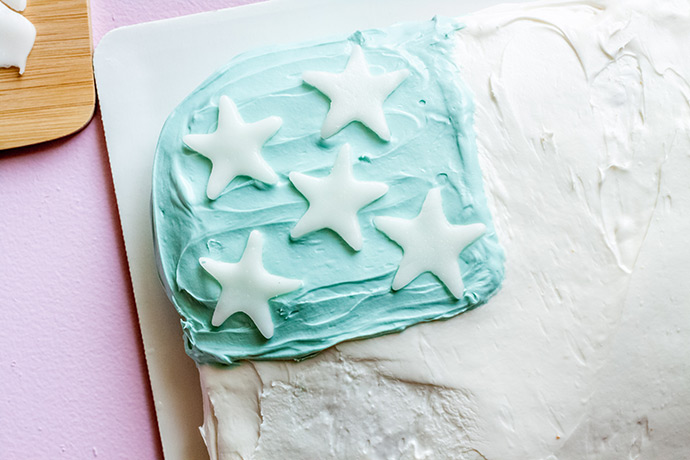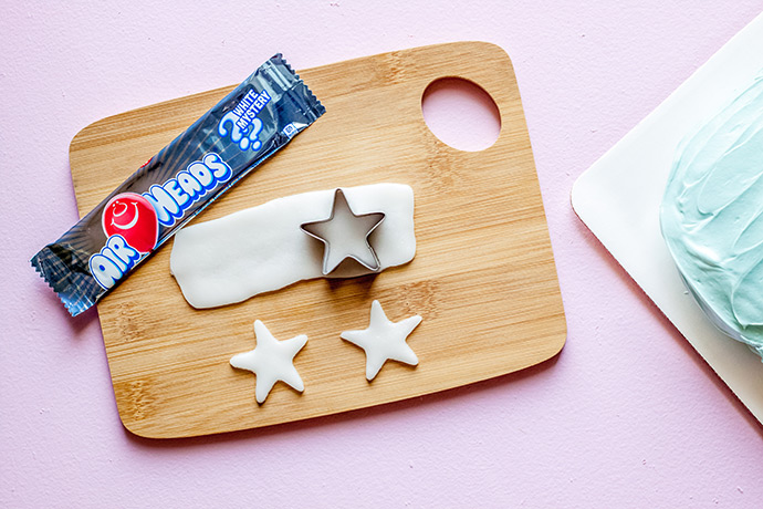 Use your hands to flatten out a piece of “mystery white” AirHeads candy, and use your cookie cutter to create a star. Repeat this step until you have five stars. Place them in the blue rectangle on the cake.
