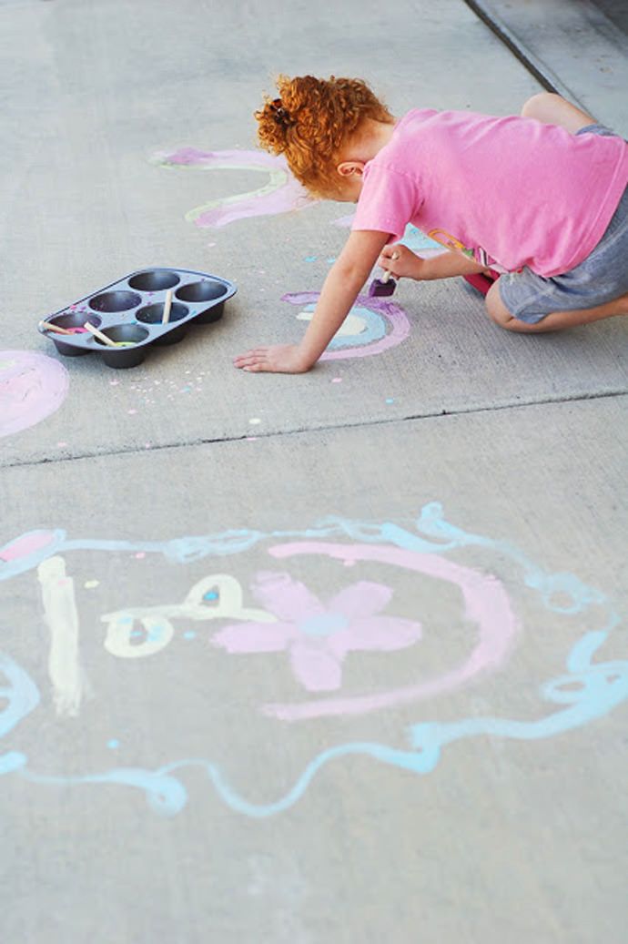 Luckily, there are bloggers out there already a step ahead of me, creating tons of fun ways to reinvent the humble piece of chalk. With homemade recipes and original ideas floating all around the place, it won’t take long to find your favorite. I’ve handpicked a couple of the projects I know my family wants to try – the ones that don’t require too much know-how or prep time, but that still produce super fun results. Because that’s how we roll around my house – by the seat of our chalk dust covered pants!