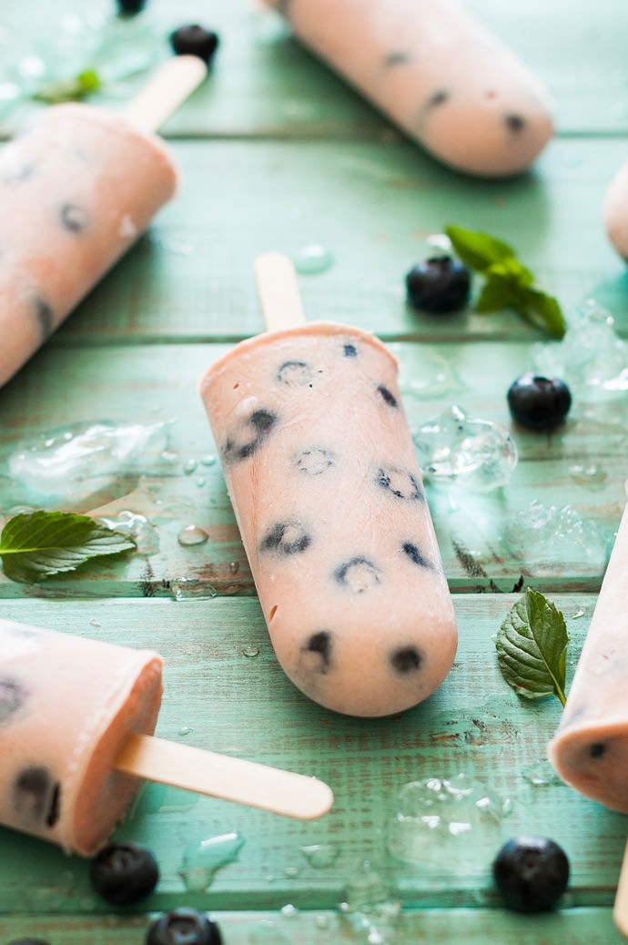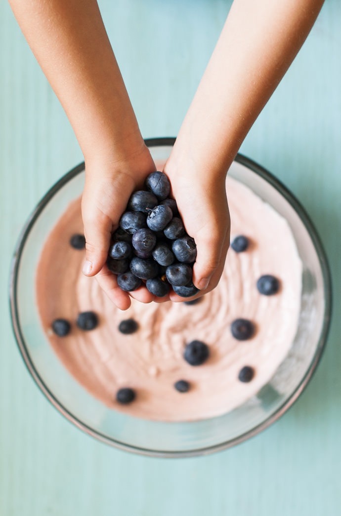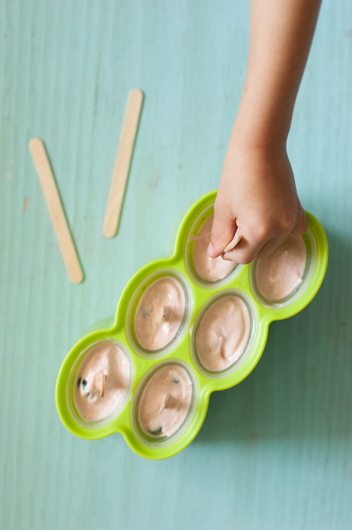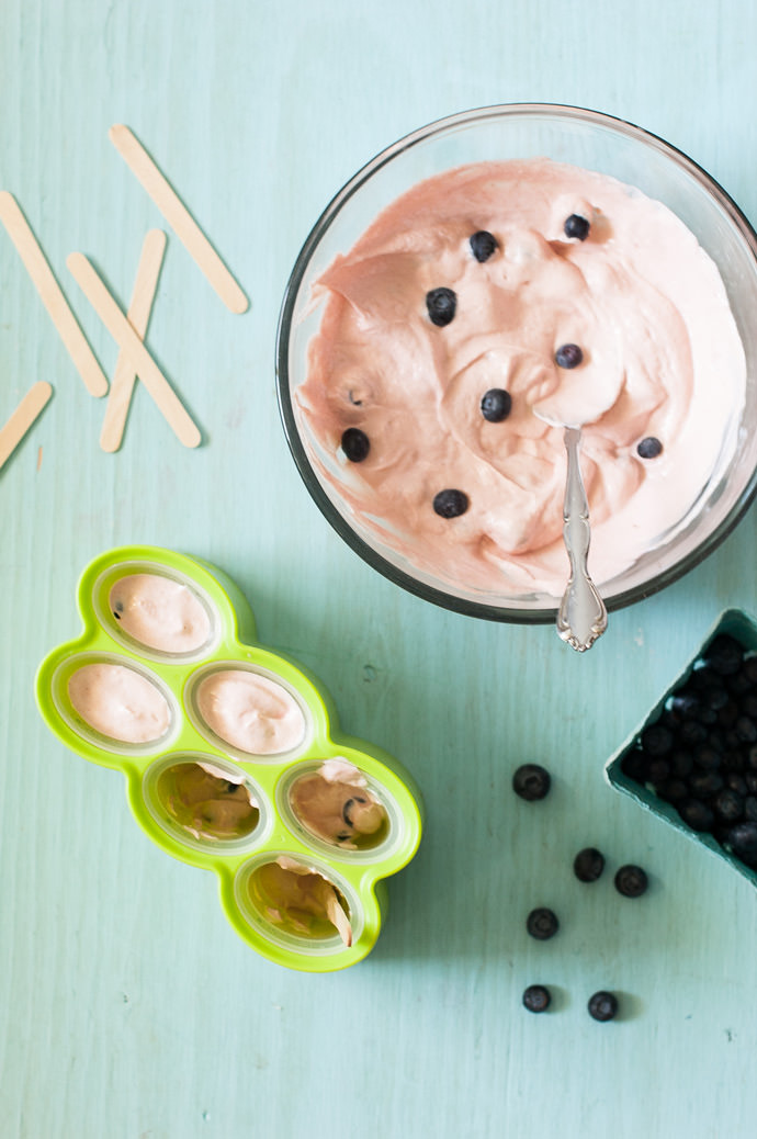 Spoon the mixture into popsicle molds, tapping the mold to help the yogurt settle into air pockets. To get a polka dot look on the outside of the popsicle, insert a popsicle stick in the center of each mold and press the blueberries against the sides of the mold.