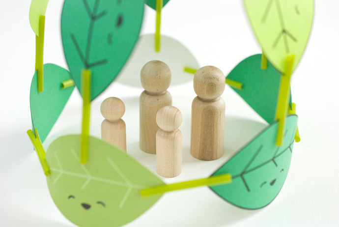 Then I added a little family of simple peg dolls. I think they might just be a family of fairies who are friends with the leaves that form their home!