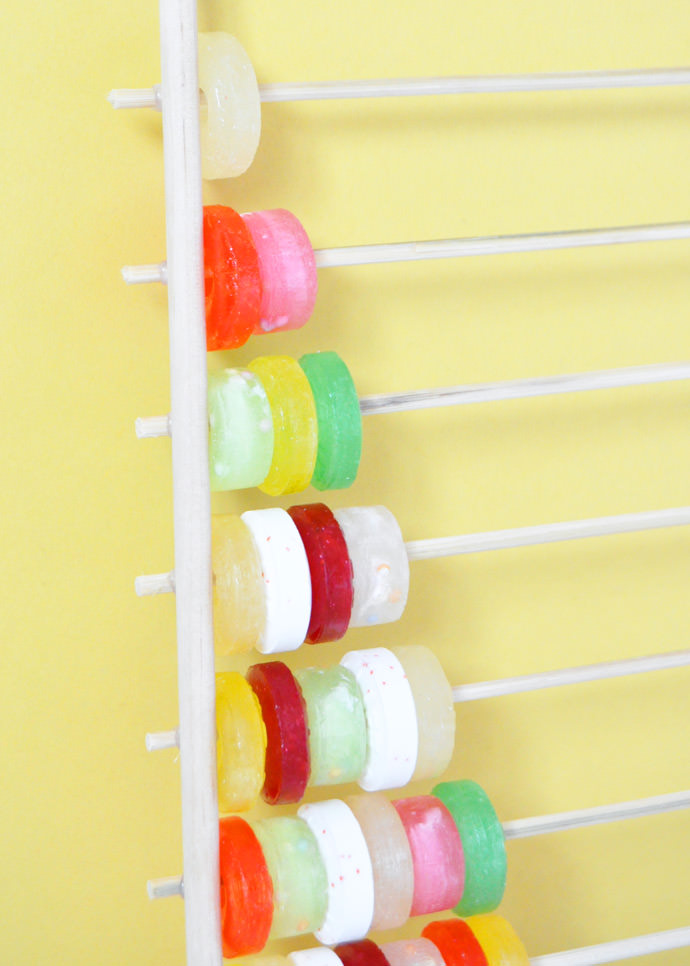 Did you have an abacus growing up? I didn’t, so I thought it would be fun to make one from scratch! I have a huge sweet tooth, so I couldn’t help but use Lifesavers candies as the beads. Of course, because the candies are unwrapped this abacus won’t last forever – you’ll want to eat the candies before too long!