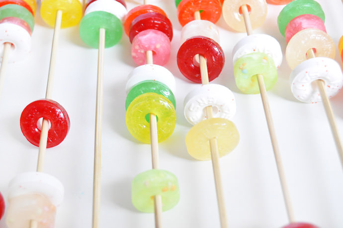 Hot glue each wooden skewer onto the wooden dowels using the tick marks from earlier. Make sure you use enough glue so that the skewers are secure – the candies can be heavy! Tie strings around these joints too for extra strength if you like – it just makes eating the candy later a little bit harder. (NOTE: You can also coat the candies with a sealer if you aren’t planning on eating them and just want a playful look. Because the candies are unwrapped, this abacus won’t last forever but if treated with care it should last a few homework sessions before it’s gobbled up!)