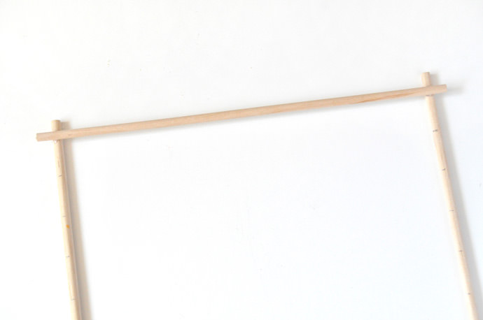 Hot glue the two short dowels to the end tick marks on the other two dowels, making a rectangle.