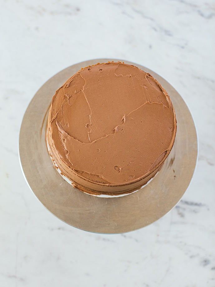 Cut each cake layer in half horizontally, for a total of four layers. Layer and frost the cake, putting about 1/3 cup of buttercream between each cake layer.