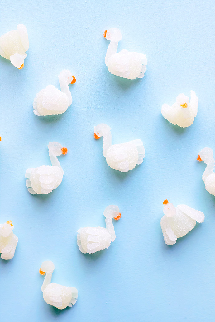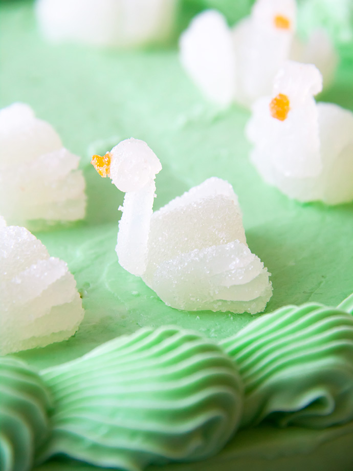 Thanks to the “12 Days of Christmas” song, we can combine two of our favorite things (Christmas and swans), into one little project! I have always wanted to throw a swan-themed Christmas party, and now we have the perfect cake toppers. I bought a light green cake (hey, you can’t make everything!), and a bag of gumdrops, and that’s really all you need to make the cutest swan cake ever. Well, that and a knife!