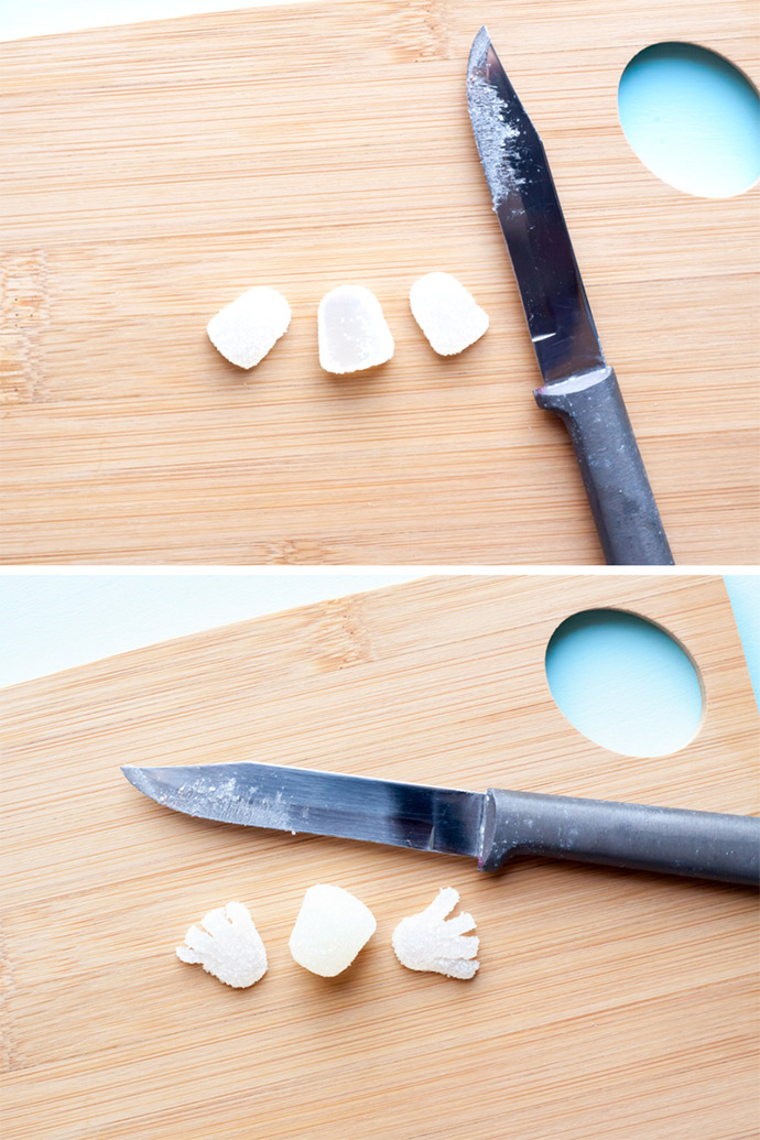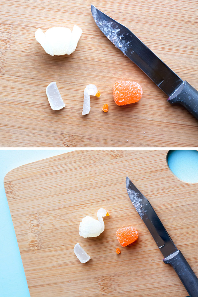 Lay a white gumdrop on its side, and use a knife to make a cut (the long way) between the middle and edge of the gumdrop. Make an identical cut on the other side of the gumdrop. These two pieces are the wings. Cut about four slits in each wing from the wide end (toward the narrow end) to almost the middle of the wing pieces. Fan the wings out, and attach them to a whole white gumdrop with the narrow ends of the wings touching the narrow end of the gumdrop. They are sticky enough to attach with a little pressure.