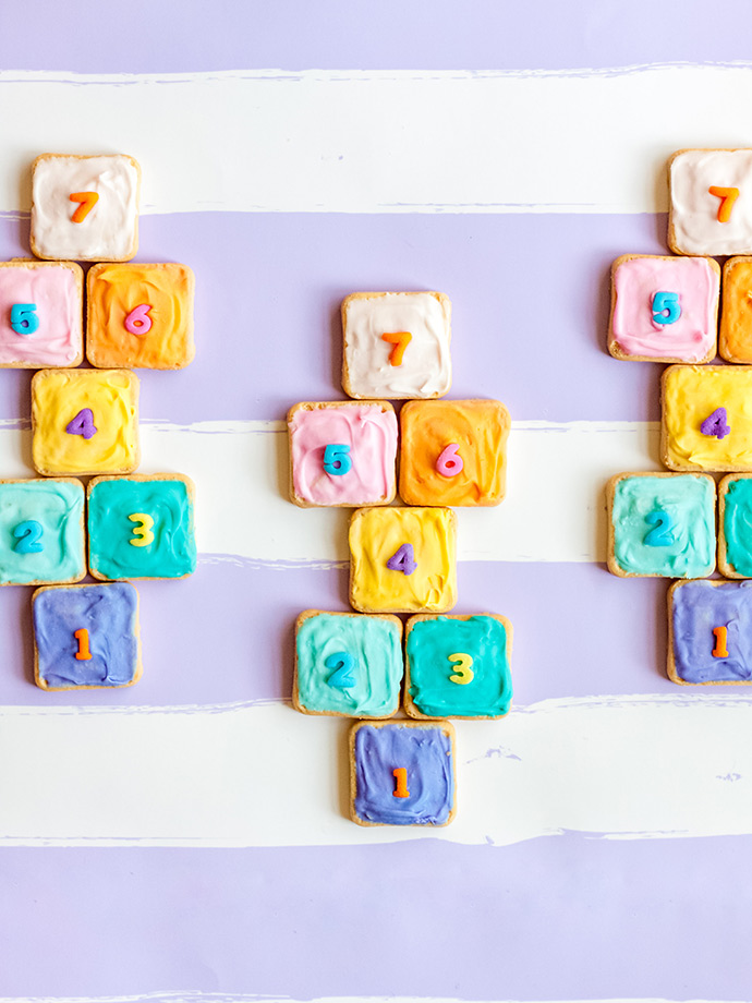 Arrange your frosted cookies into a hopscotch board on a paper plate. The pattern is 1-2-1-2-1.