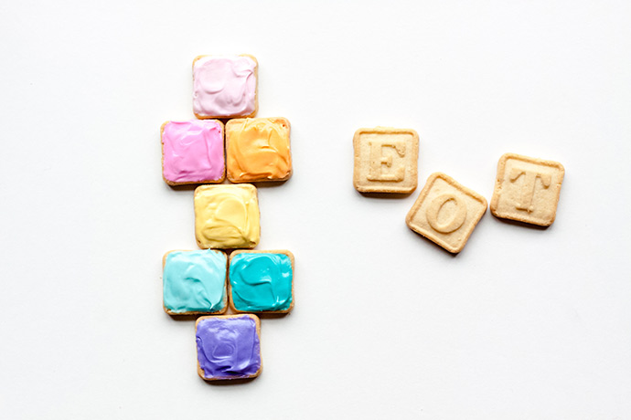 Mix your choice of food colors into small bowls of white frosting, and spread seven different colors onto your square cookies.