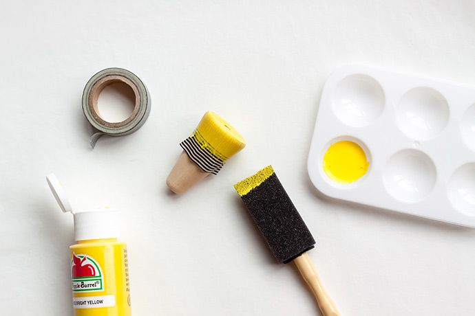 Place a piece of Washi tape slightly over ½” from the bottom of your cone (the wide end). Go all the way around the cone, until the ends meet up perfectly, and overlap. Press it down as much as possible. Try to smooth out any wrinkles. Use a sponge brush to paint the bottom section yellow. You may need a few coats of paint. Allow to dry.