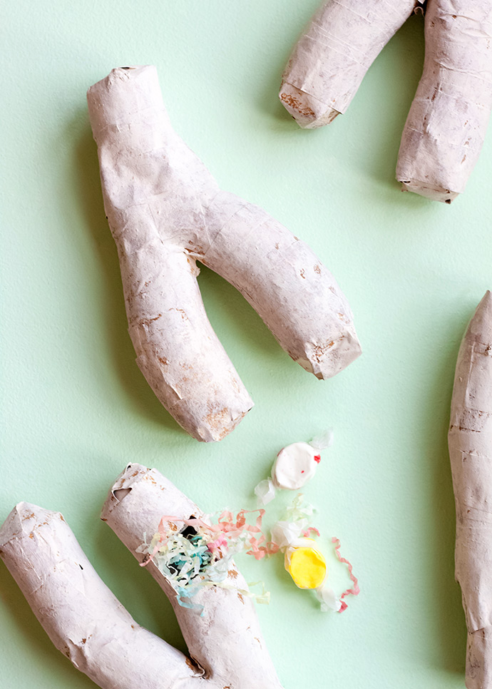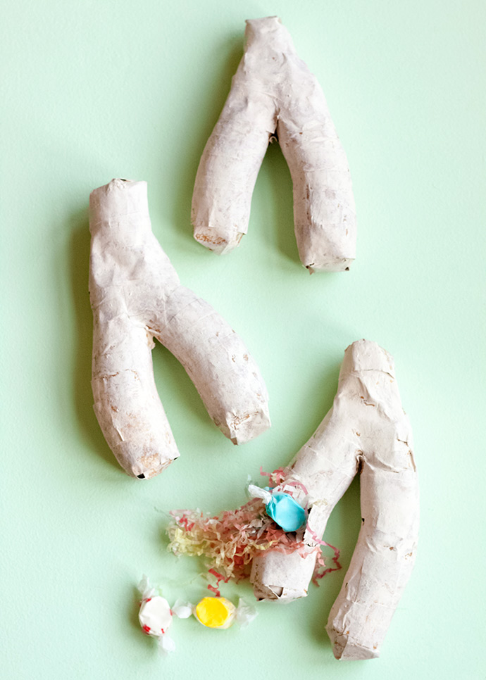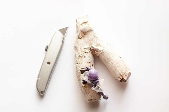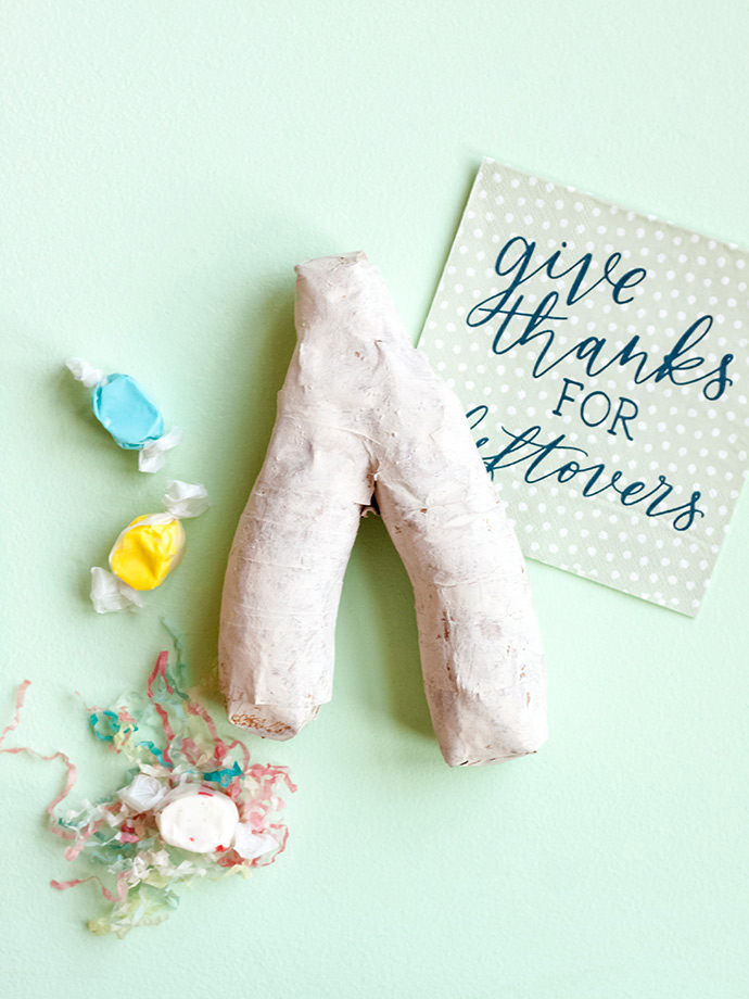 Use a box cutter to cut a small door in the back of your wishbone. Take out the balloon, and shake out any glue flakes. Fill the piñata with fun Thanksgiving goodies.