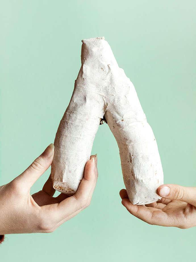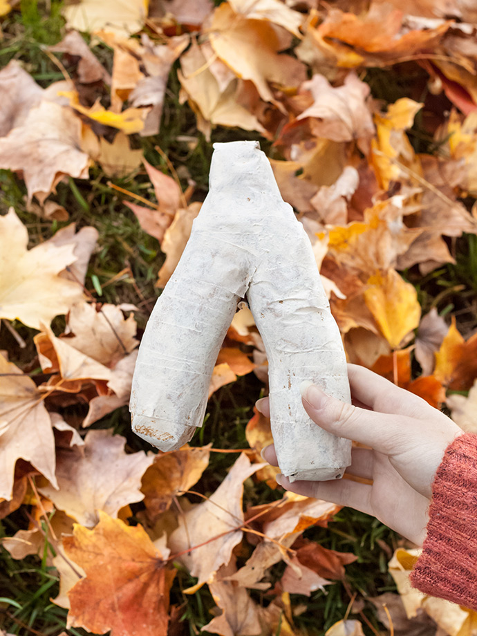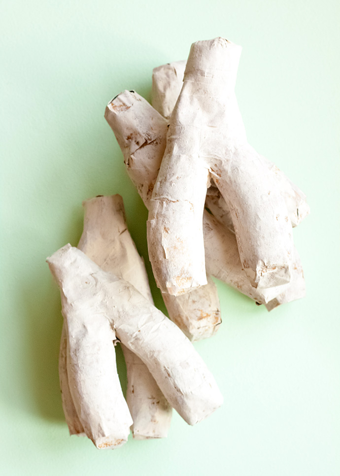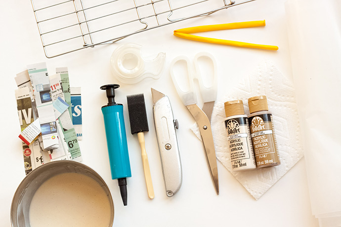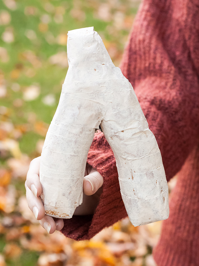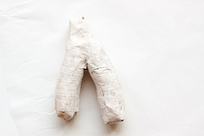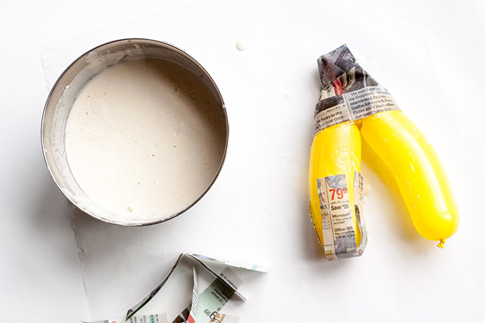 Dip your newspaper strips in paper mache paste (one at a time), and smooth the pieces out on your balloon. It is easiest to start at the top “stub”, and create an “x” over it with two strips of newspaper. Continue to wrap the balloon in strips until it is completely covered. When you get to the bottom, it works best to create an “x” on each end with newspaper strips as well, and then continue working to cover the entire wishbone. Allow to dry on a cooling rack.