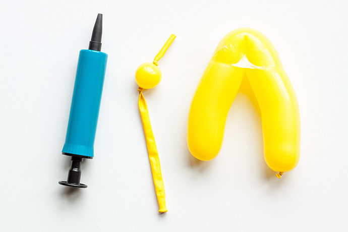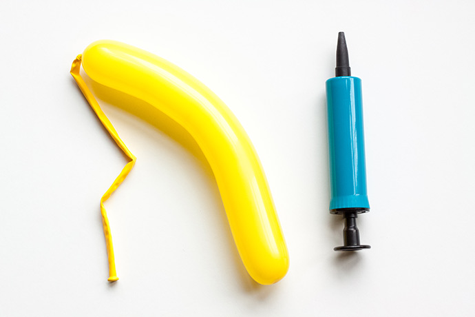 Use a balloon pump to blow up a twisty balloon, and then let out some air until the balloon is about 11 inches long. Tie it off at the end, and cut off the excess balloon.
