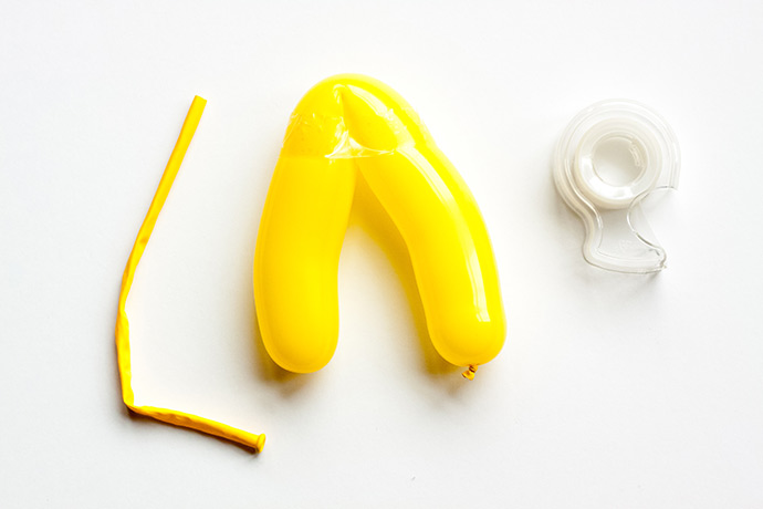 Fold the balloon in half, and put a long piece of tape around the top to hold it in place. Bend the two sides out a bit to look like a wishbone.
