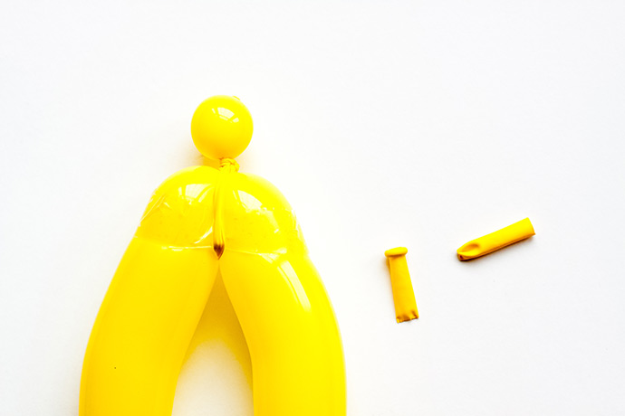 Take the remainder of the balloon, and tie a knot in the cut end. Use the balloon pump to blow it up, and then let out some air until you have a 1 ½” stub. Tie off the end, and use the remaining balloon “tail” to tie it around the folded wishbone balloon. Cut off any excess.