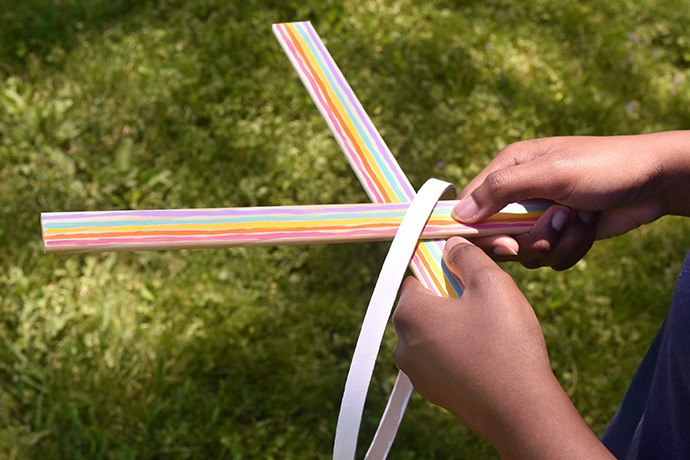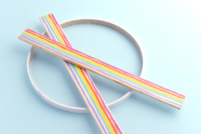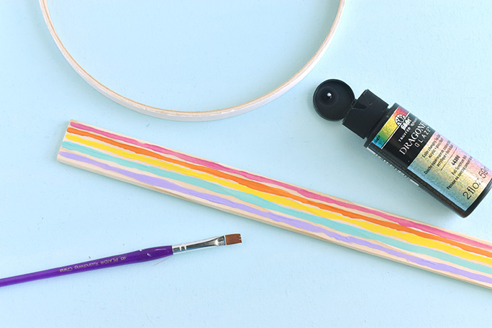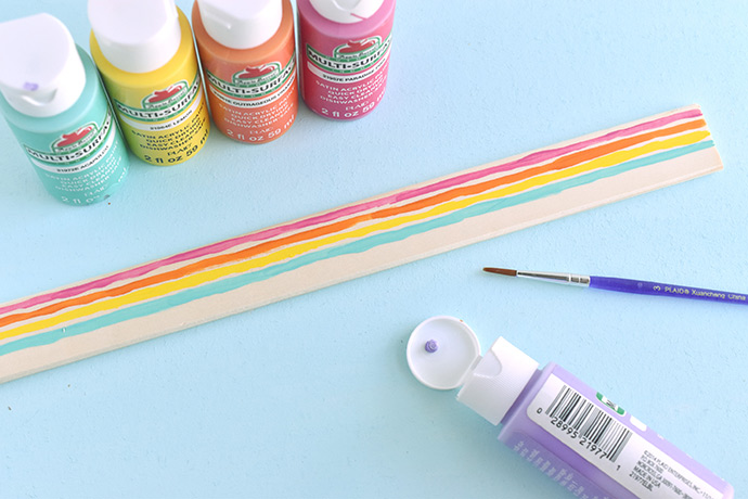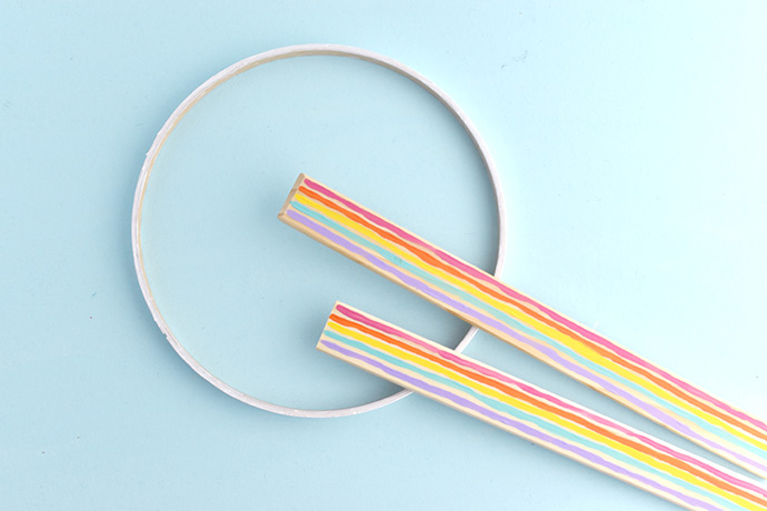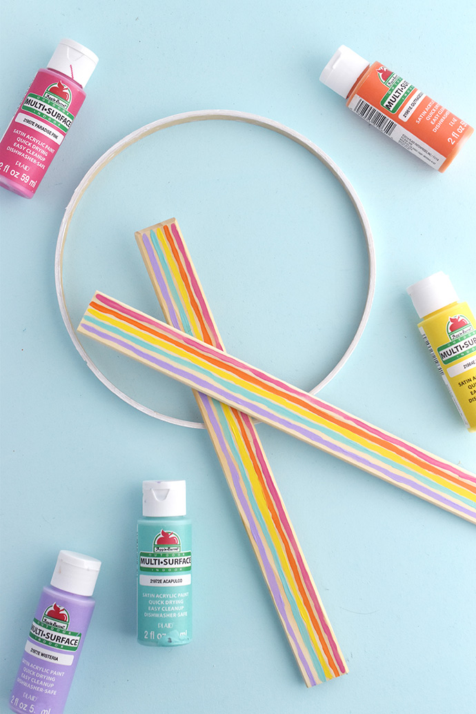Paint rainbow stripes on the wooden slats or sticks. If you like precision, use tape to mask off the lines as you paint. You can also just paint semi-straight lines like you see here!
