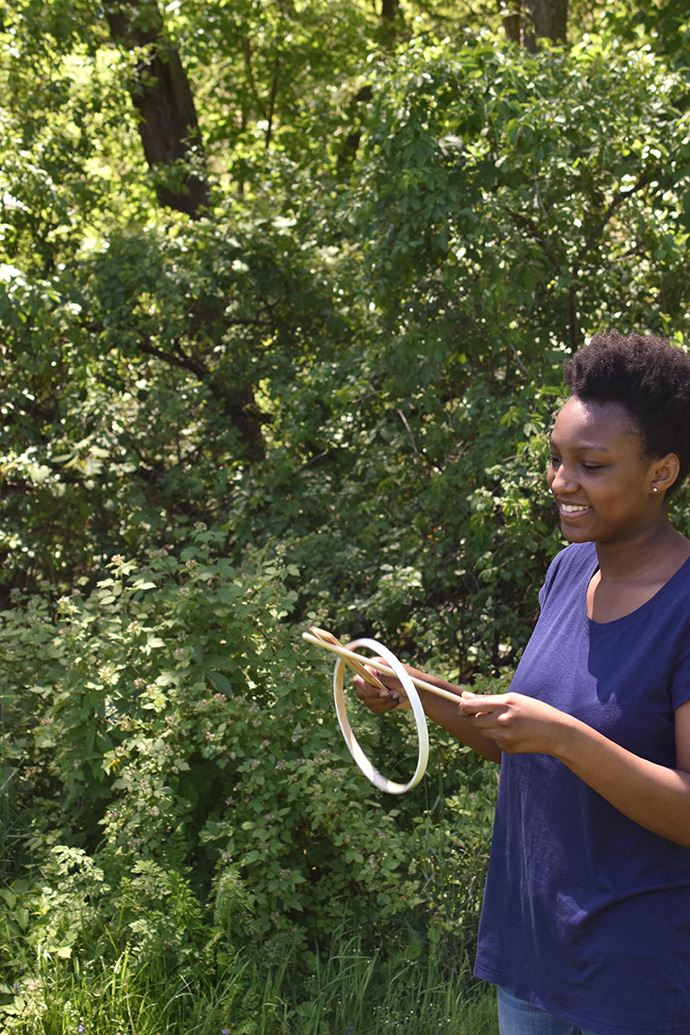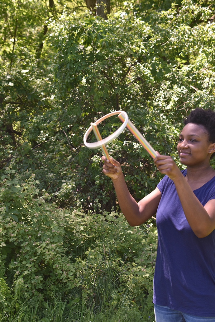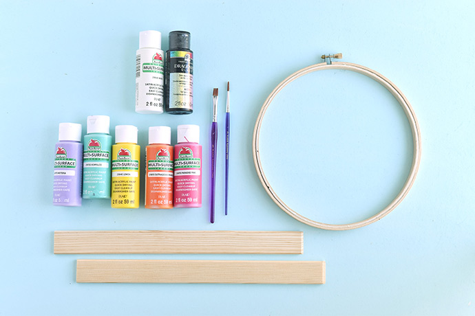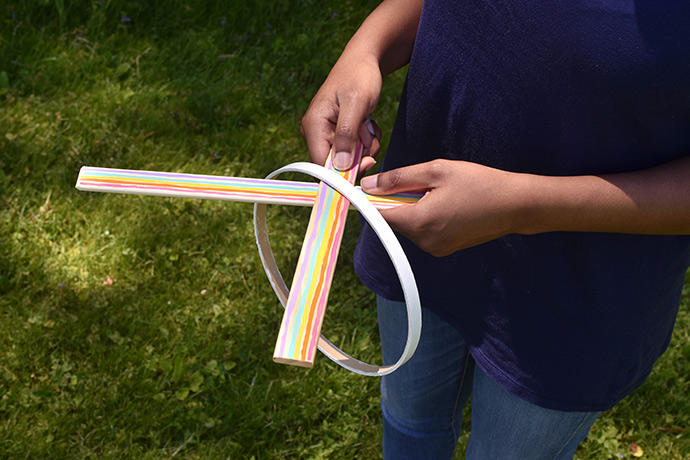 NOTE: We used a 7-inch hoop and wooden slats because they were on hand and the size worked well together. You can use two long rulers, smooth wooden sticks, or even pencils for this. The smaller your sticks are, the smaller the hoop will need to be, so be sure to test the game before you start the project.
