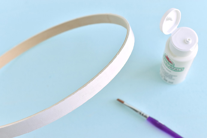 Paint the hoop white. Add a few coats so the wood doesn’t show through. You can paint the entire hoop, inside and out, but the inside may scratch up a bit as you play the game.