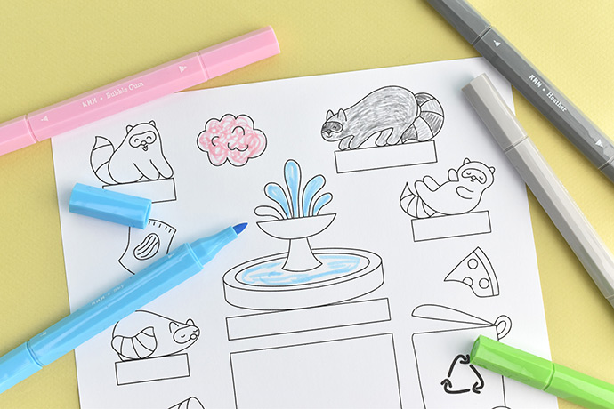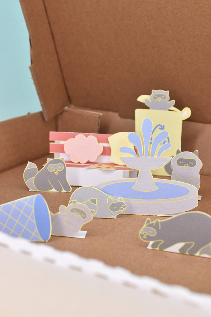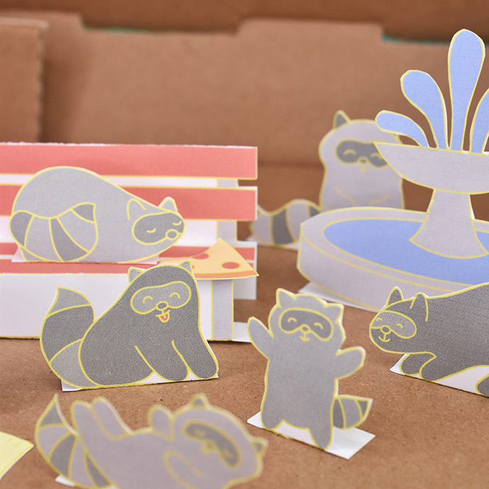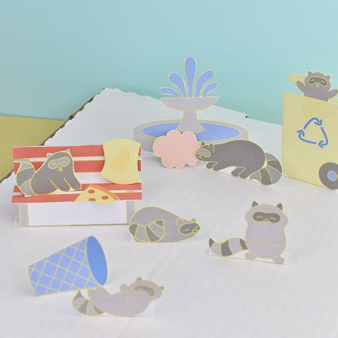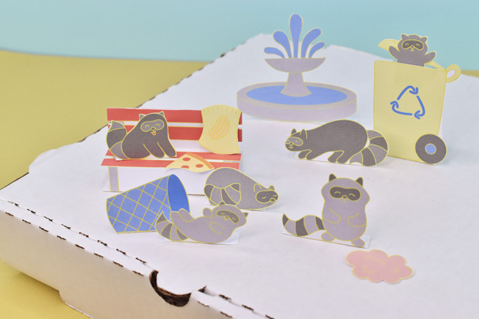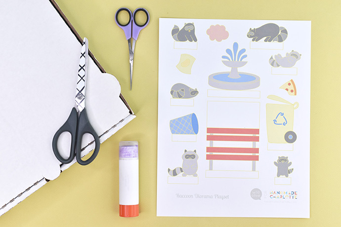 Print and cut out these curious (and hungry!) raccoons and make a fun scene in the park! They can play on a park bench, dig through the trash, and even wash their breakfast in the fountain. It only takes a few minutes to set up with our free printable diorama playset!