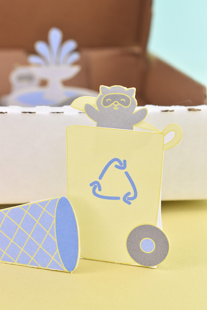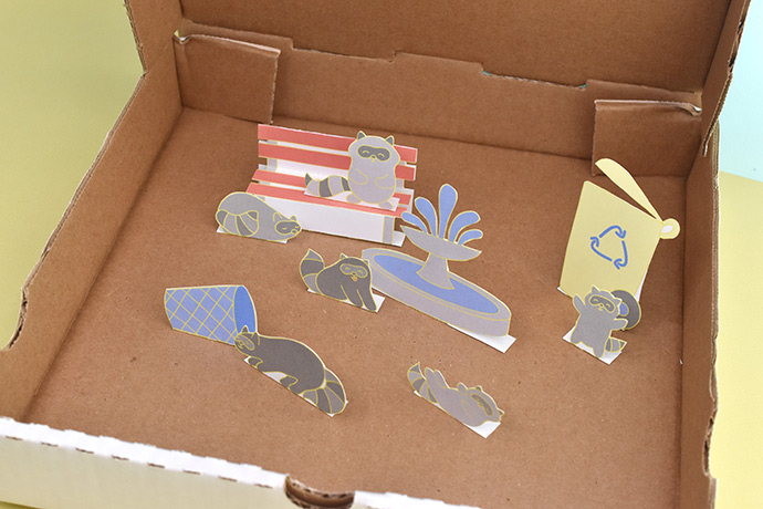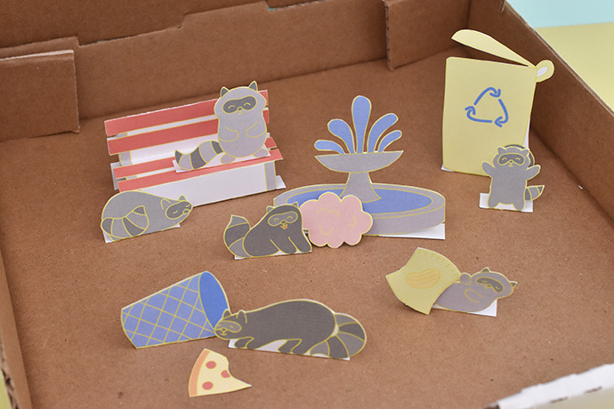 This is the last in our series of animal habitat diorama playsets, each of which has a group of critters with a recycled habitat element. The latest printable features robins living in a tree. And we couldn’t resist using a pizza box for these raccoons!