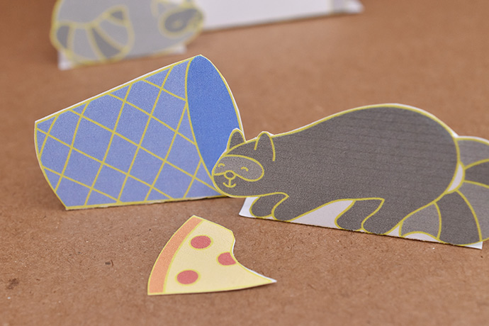 While one furry friend sniffs a bag of chips, another might find part of a pizza slice. You can also add more trash to the scene by crumpling little balls of paper.