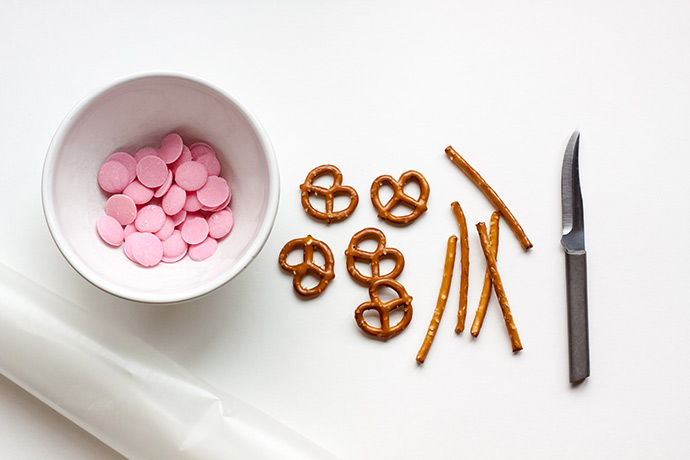 Use a sharp knife on stick pretzels and mini pretzels, to create the alphabet. You may have to combine pretzel curves with straight pretzels. Use the photo above to reference the different cuts. Try to keep all off your letters around the same height. If your pretzels break in unexpected places, you can always “glue” them together with the melted candy, so don’t despair!