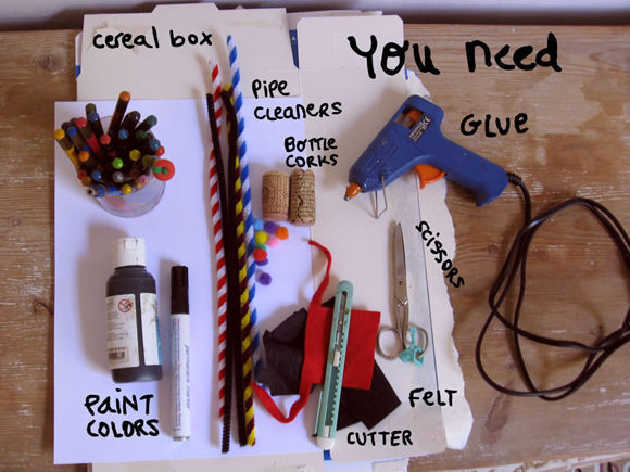 Take one pipe cleaner for the legs, fold it in half, and cut. Take another pipe cleaner stem for the arms. Now lay the back shape of your puppet (the plain cereal box shape) down, wrong side up, and place the legs and arms, then glue. Place the front character shape (your printed colored shape, right side up) on top of it, seal with glue, then press!